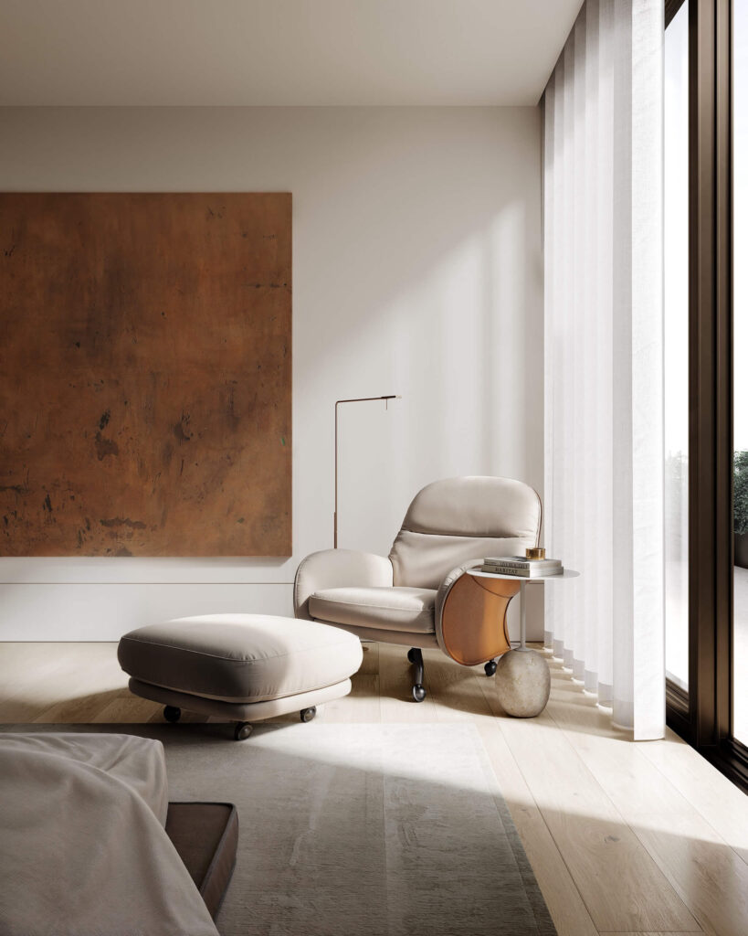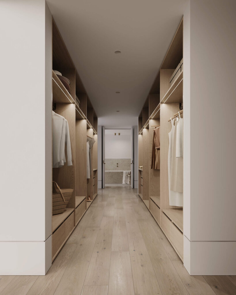 In the master bedroom, a tranquil sitting area basks in light and warmth, while the dual walk-in wardrobe features custom-designed storage solutions and well-lit display areas to make everyday dressing a pleasure.