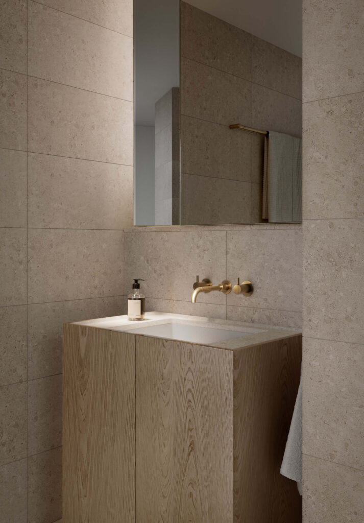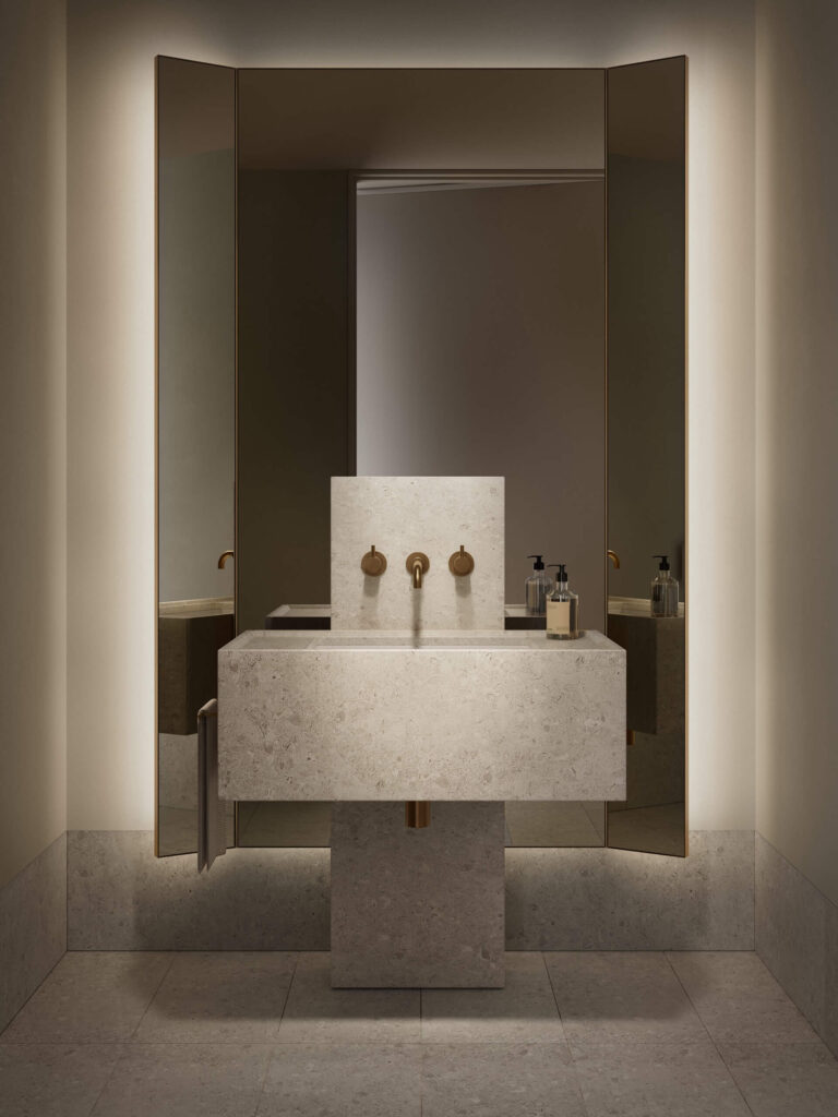 Both beautiful and functional, the bathrooms are wellness sanctuaries. Textural contrasts and the soft glow of brass lighting create a calming, restorative backdrop to preparations for the day ahead or a long, languorous soak in the oversized bathtub to wind down in the evening.