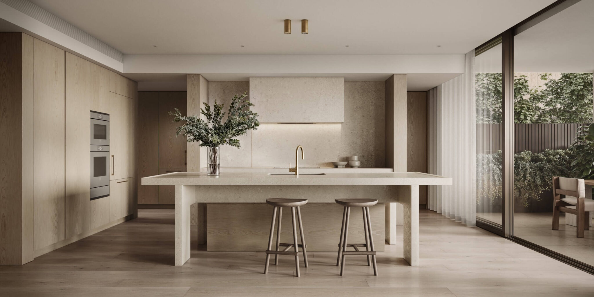A neutral palette and organic materials are the foundation of Hecker Guthrie’s contemporary and textured composition. Honed marble, brick, stone, oak and brushed brass accents are evidence of exceptional craftsmanship and enduring quality.